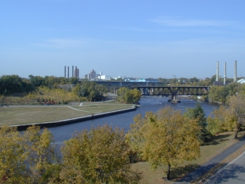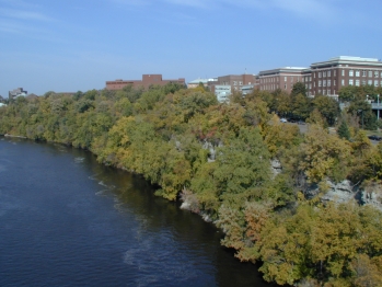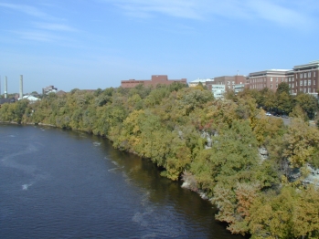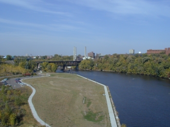 | Another view from the bridge. There is a park area along the river.